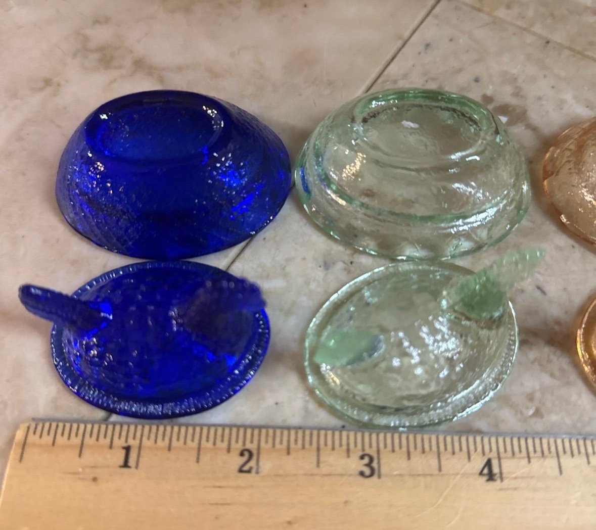 These are so hard to find, especially in a set of four :-) the colors are blue, pink, green and Jadeite :-) there are no cracks or chips :-) I was very lucky to get my hands on another handful of these :-) don’t know if I’ll get anymore :-) I am an experience, vintage glass shipper and fast shipper :-) PS : Mercari states these are worth $22 a piece and that equals $88 so wow what a deal I am offering :-)