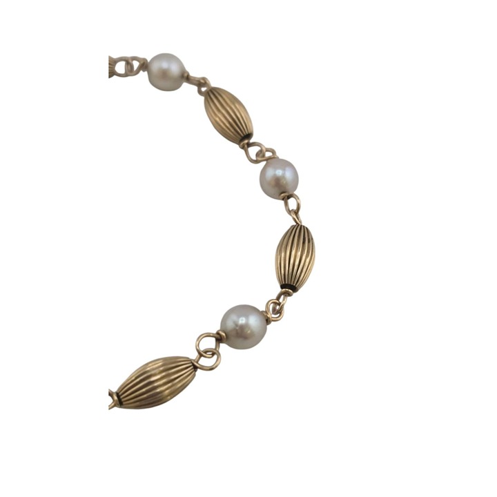 Vintage 14kt Fluted Gold Beads and 8mm Pearl Bracelet (A1653)