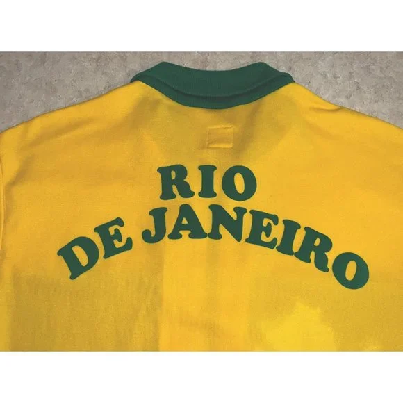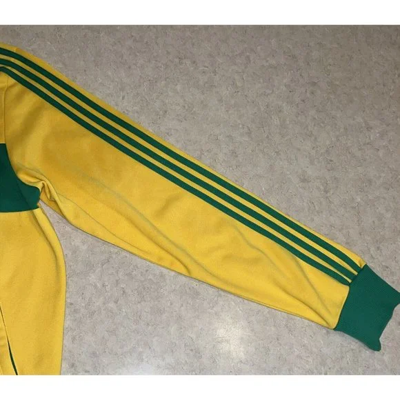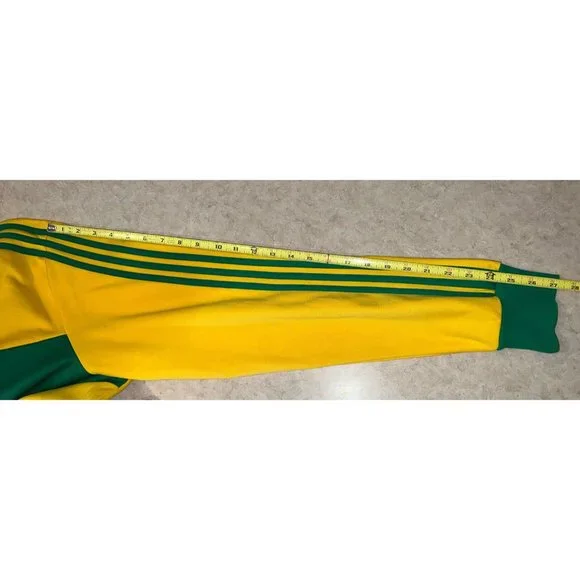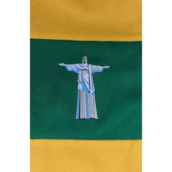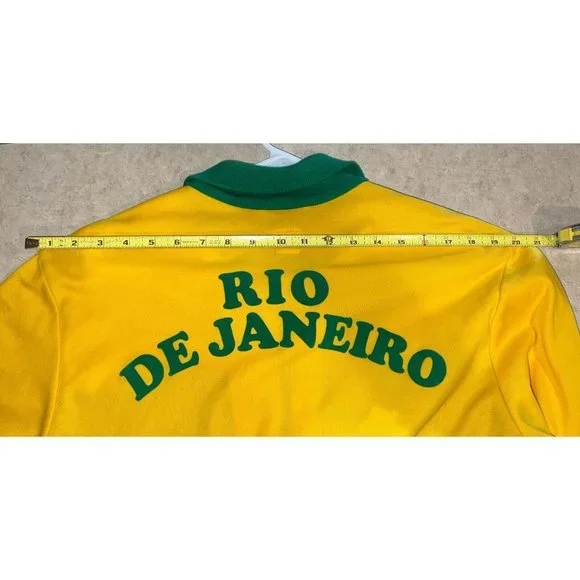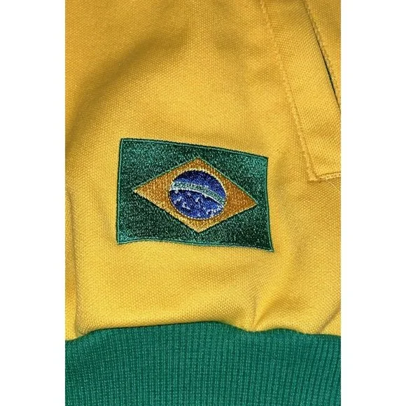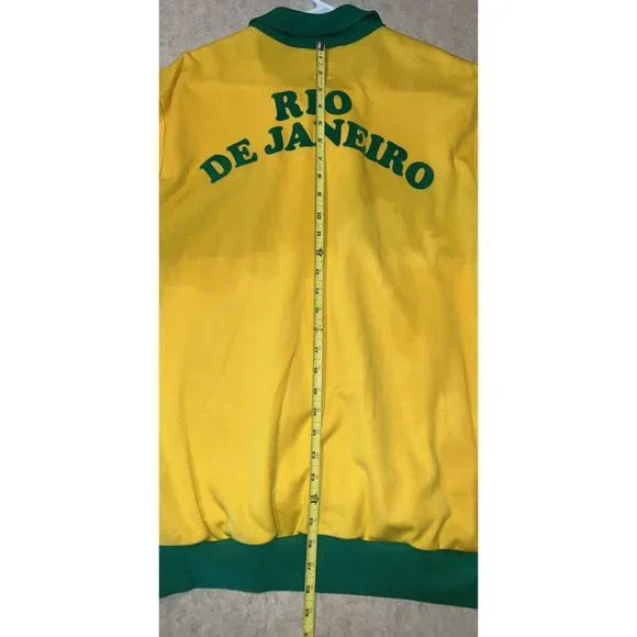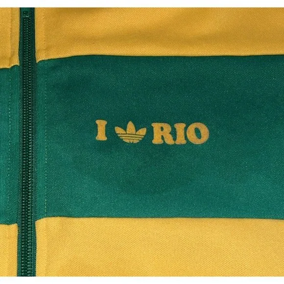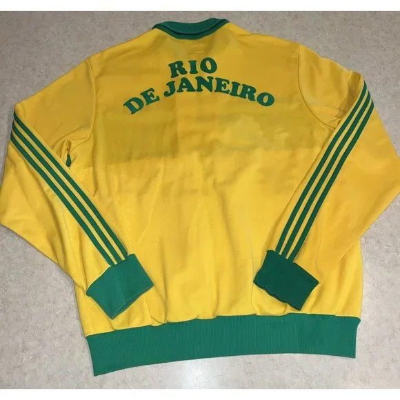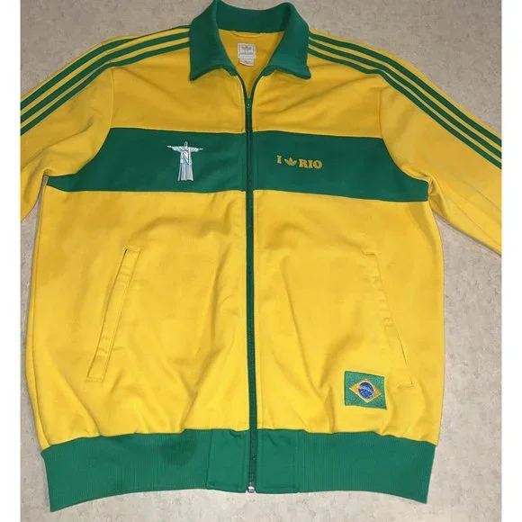 RARE Adidas Jacket - Excellent Pre-Owned ConditionBrazil Rio De Janeiro Soccer / Football Tracktop Jacket Size XLSize measurements indicated in photos, measured on a flat surface. Smoke and pet free home. FEATURES:Full zip ClosureContrast ribbed Stand-Up collar3 Stripes branding to the sleevesRibbed cuffs and hemRio De Janeiro Jesus Statue on right side chest2 side zipped pocketsBrazilian Flag embroidered patch on left pocketI Love Rio adidas branding to left chestCOLOR: SUNSHINE / FAIRWAY