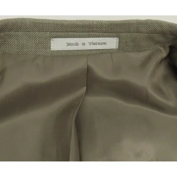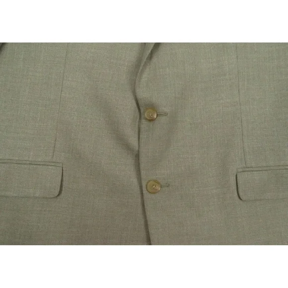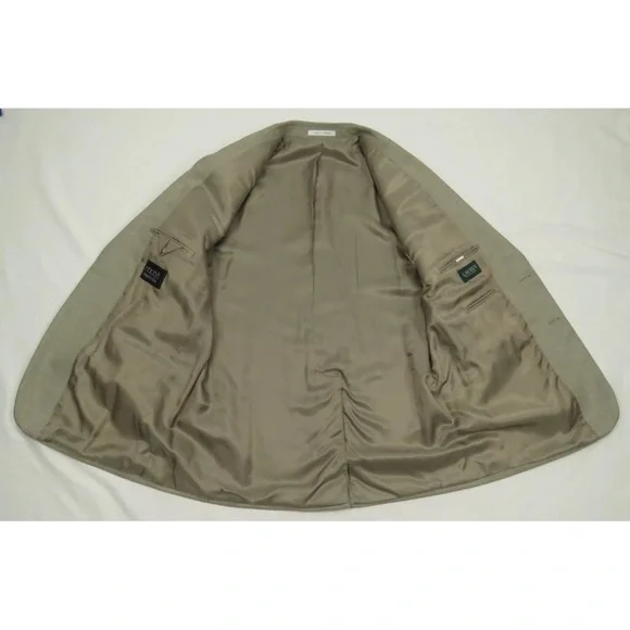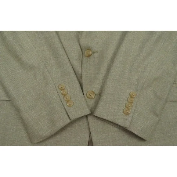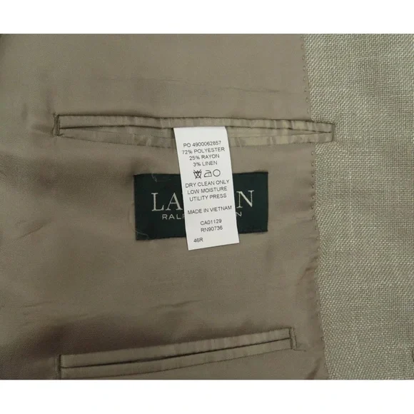 Description: NWOT Lauren Ralph Lauren LRL Linen Blend 2 Button Tan Blazer Sport Coat Jacket -Two button closure-Two front flap pockets-Left chest pocket-Single vented-Four button cuffs-Notch collarSize (Check Measurements): Mens 46 RColor: TanFabric: 72% polyester, 25% rayon and 3% linenCondition: New Without TagsItem#: 65547Measurements are in inchesArmpit to armpit: 24 1/4"Back bottom of the collar to the hem: 31 1/4"Shoulder to shoulder: 20 1/4"Shoulder seam to end of cuff: 25 1/2"BUYING VINTAGE·We do our best to thoroughly inspect all items for any visible imperfections i.e., rips, repairs, holes, stains, etc. and note as such.·Please note vintage sizes are not always comparable to today's sizing. Please refer to the measurements in the description for a more accurate depiction of the true size. If an issue should arrive, please contact us prior to leaving a negative as we strive for providing excellent customer service.Please compare your measurements to the measurements provided in the listing description to ensure a proper fit.