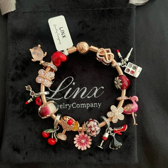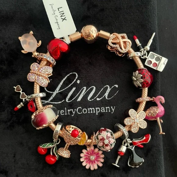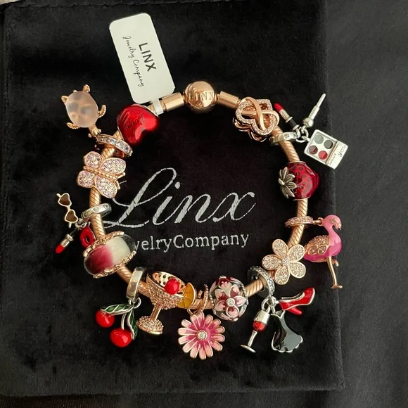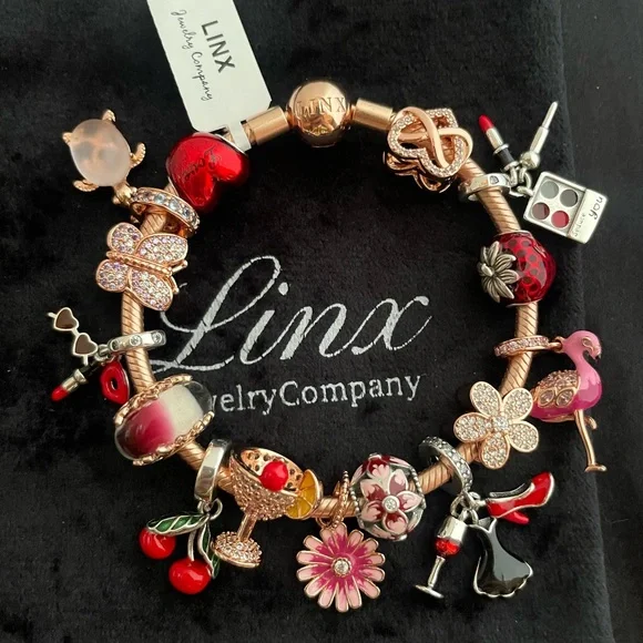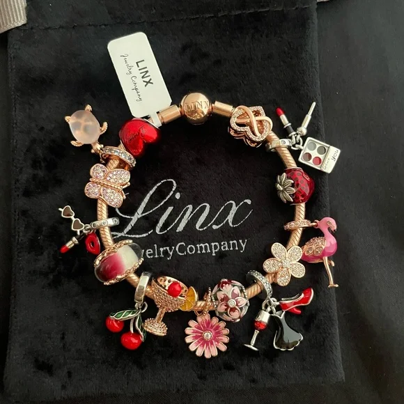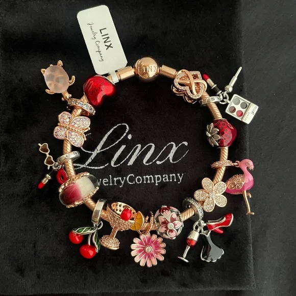 Linx snake chain style charm bracelet in 18k rose gold over 925 sterling silver, with a ball clasp. The bracelet is 3mm in width and available in multiple lengths. This bracelet comes with 15 Linx charms in sterling silver and 18k rose gold over 925 sterling silver charms.Additional charms can be added also.All items are new and come in a luxury velvet jewelry pouch. *Bracelet and charms are SUPERIOR QUALITY.